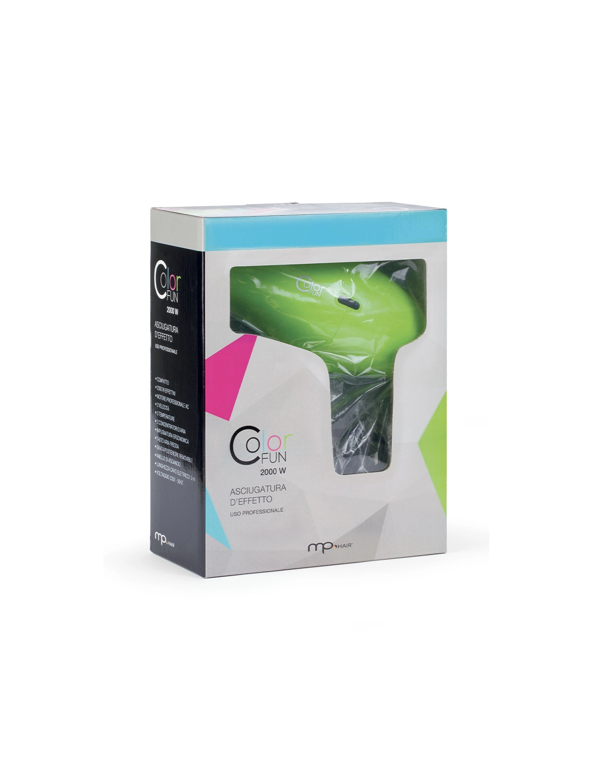Progettato per l'ambiente professionale, il Color Fun Verde unisce potenza e versatilità in un formato compatto e maneggevole. Il motore AC da 2000W assicura prestazioni elevate anche in sessioni prolungate, mentre il colore verde aggiunge una nota distintiva e moderna al salone. Le impostazioni personalizzabili di velocità e temperatura, insieme ai concentratori d'aria, permettono di realizzare styling definiti su ogni tipo di capello.