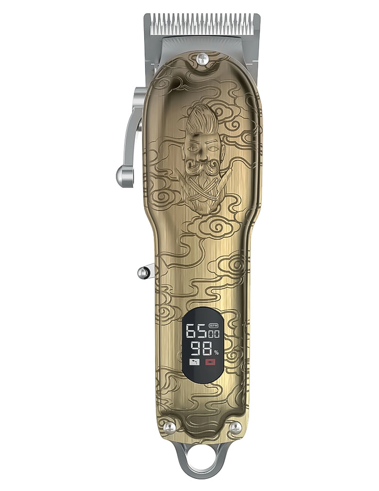 Utilizzabile con cavo o cordless, ha una batteria al Litio da 2600mAh per 6 ore di autonomia. Struttura in acciaio inox, cover in alluminio intagliato e display LED per il controllo della carica.